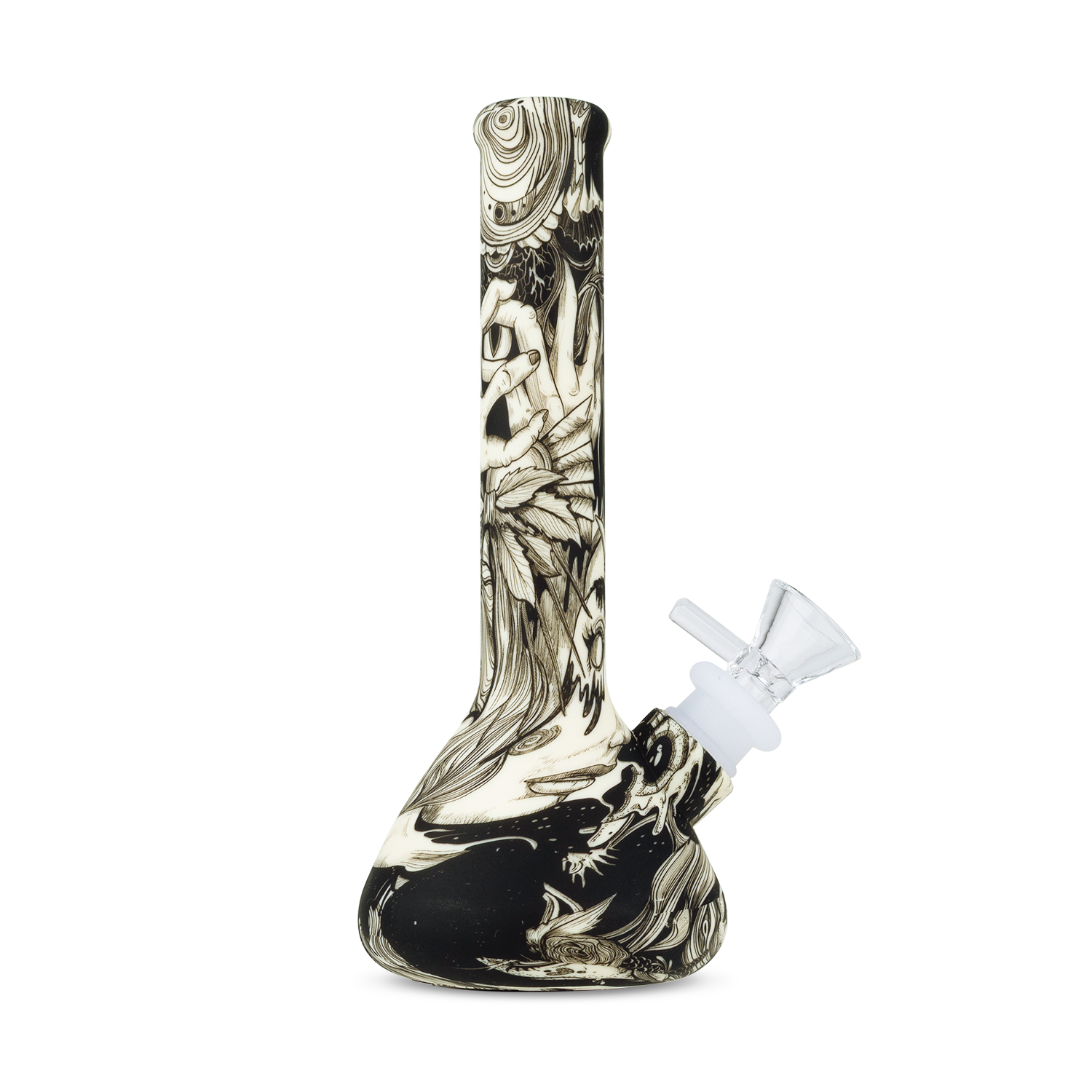 Elegante, pratico e praticamente indistruttibile. Questo piccolo bong in silicone con un misterioso design mistico in bianco e nero è la scelta perfetta per chi vuole qualcosa di sottile, ma unico.